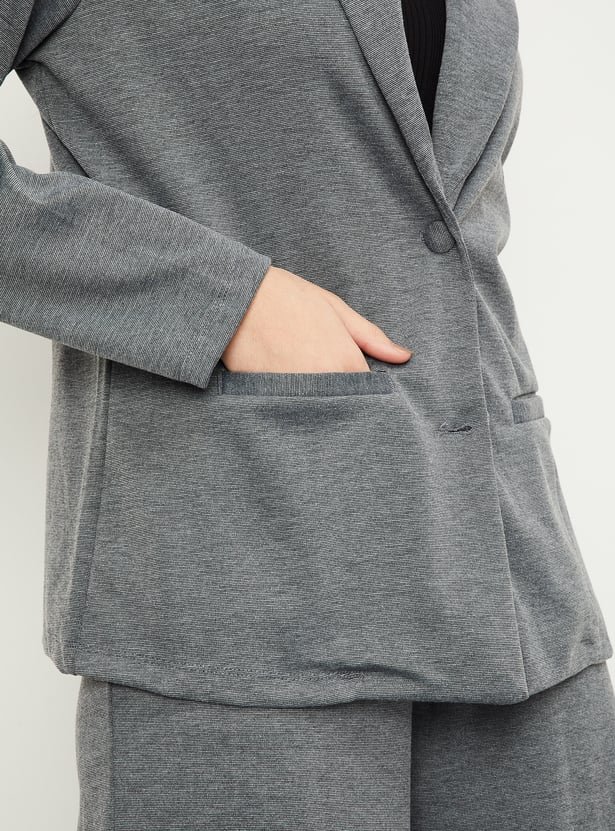 This formal blazer stands out with its sophisticated solid pattern, tailored to perfection with a classic notched lapel, a buttoned front closure, and two practical waist pockets. Its full sleeves add a touch of elegance, making it a versatile piece for both professional settings and formal occasions.